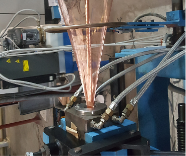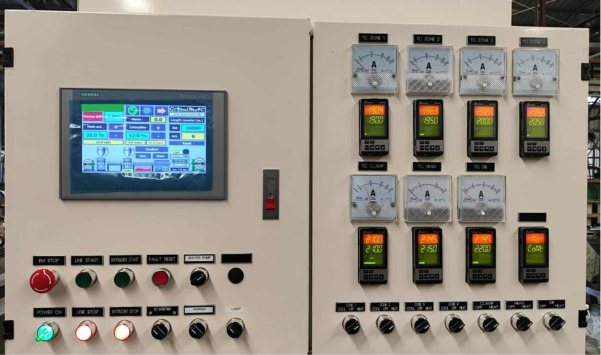 The control panel includes PLC, HMI, drives and temperature controllers. The temperature of each heating zone is displayed and controlled from the HMI.